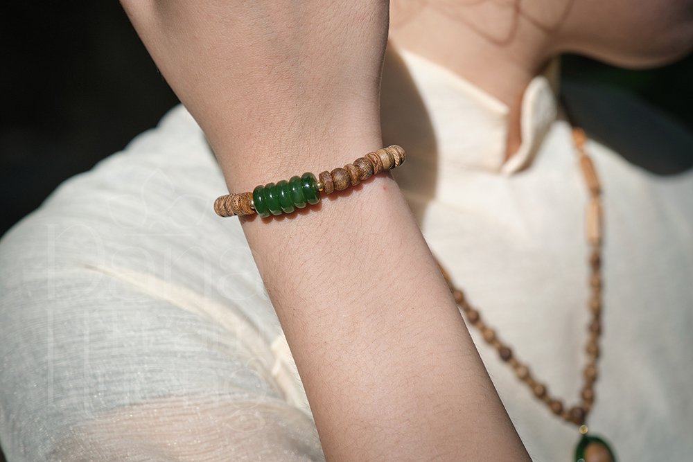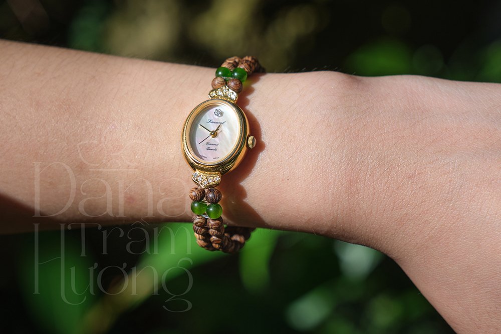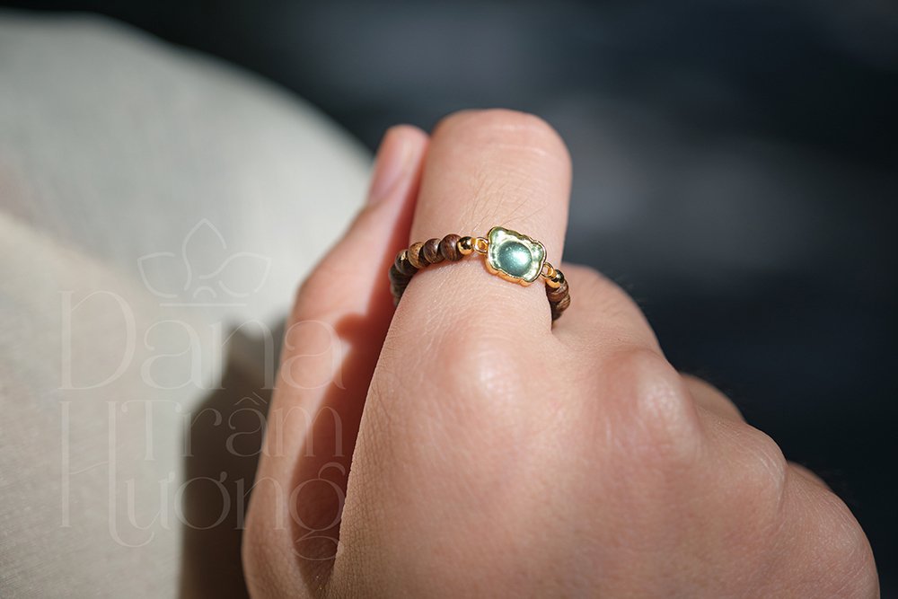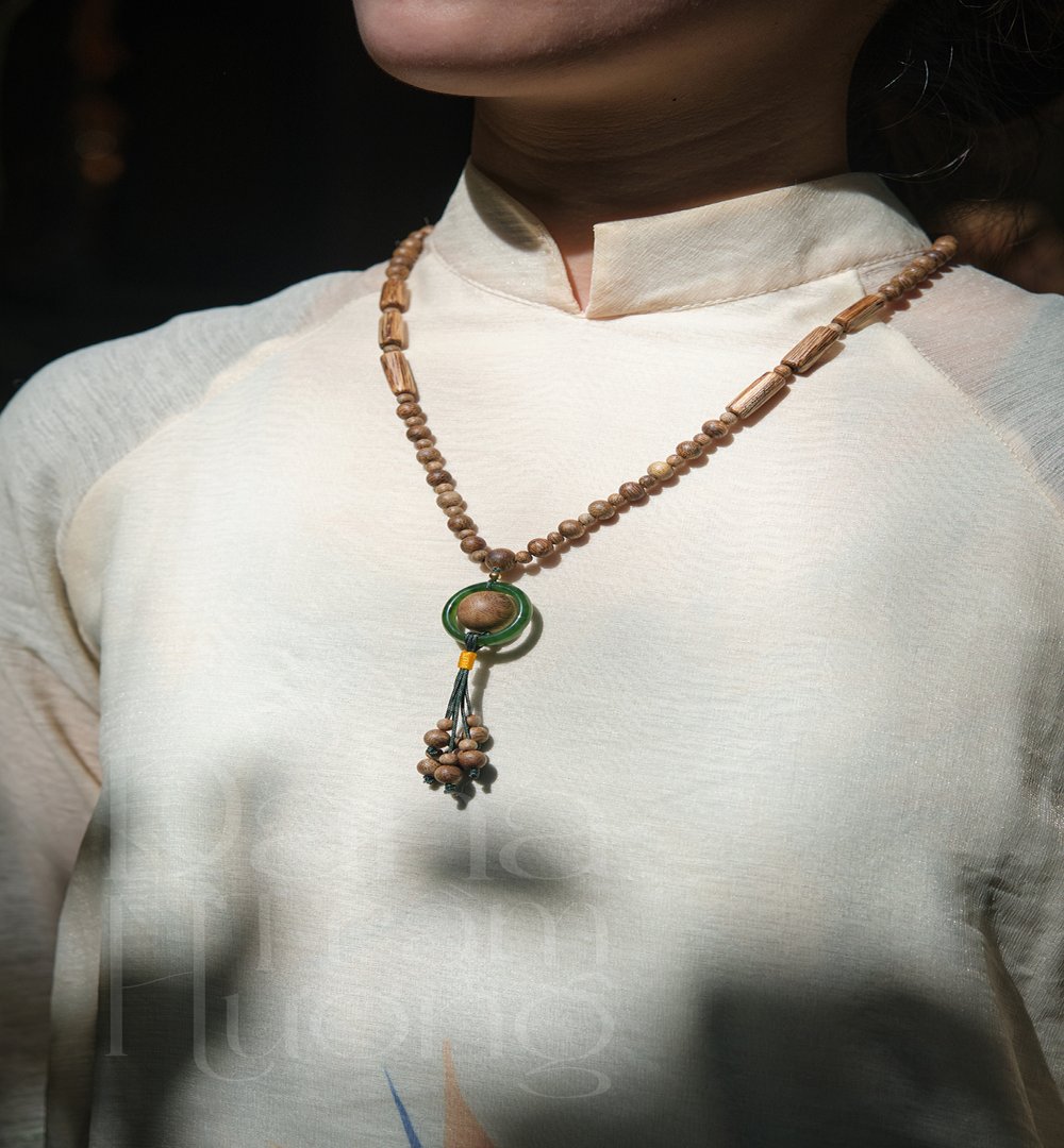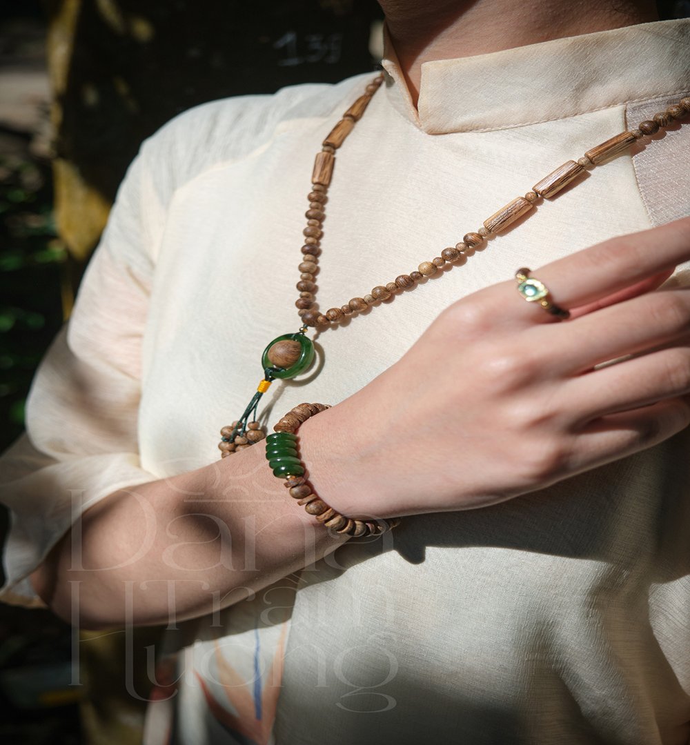 Tôi tìm thấy Bộ Trang Sức Trầm Hương Sắc Ngũ Hành – sự kết hợp giữa trầm hương thiên nhiên và những viên đá phong thuỷ tượng trưng cho Kim, Mộc, Thuỷ, Hoả, Thổ . Tôi biết, đây không chỉ là một món trang sức, mà còn là một lời nhắc nhở về cội nguồn, về những giá trị bền vững của người việt. Mỗi màu sắc đều mang theo một linh khí của thiên nhiên, một nét tính cách đặc trưng của con người Việt